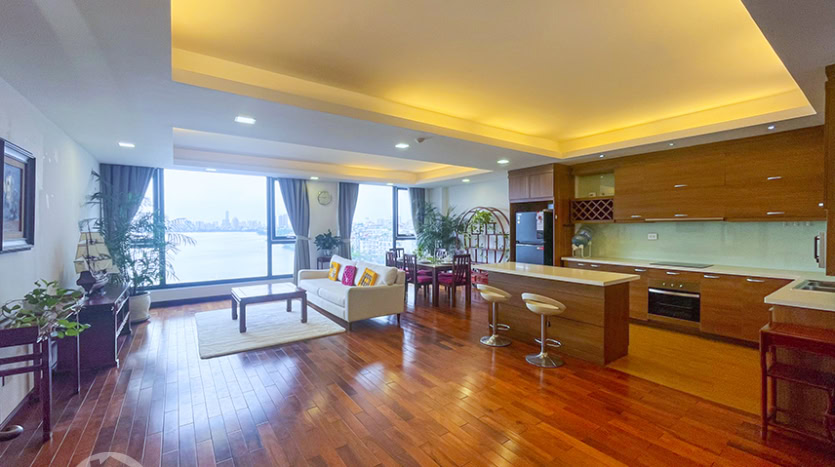This is a high quality 2-bedroom apartment for rent in Tay Ho with lake view. The apartment is quiet spacious with usable area of 135 sqm. It is fully furnished, 2 bedrooms and 2 bathrooms. The kitchen is designed openly matching the living room. It’s just two-minute walking to Syrena shopping mall. There are lots of cafes, restaurants, and other daily utilities nearby. The building has 24 hours security and gym.