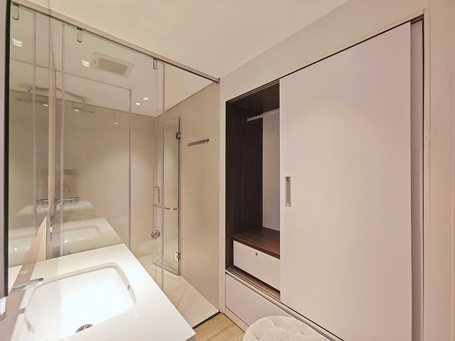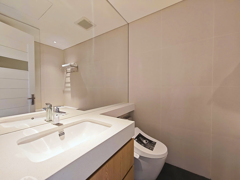 The apartment features three spacious bedrooms, each designed with ample natural light, comfortable beds, and generous storage. The master bedroom includes an en-suite bathroom, while the additional bedrooms share a well-appointed second bathroom.
