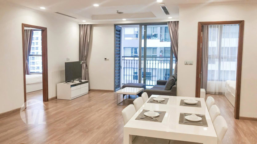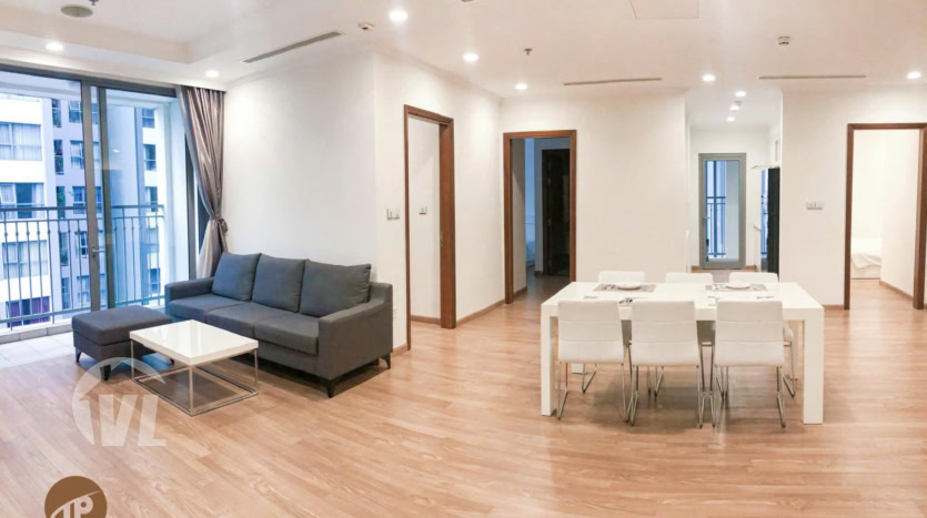 A nicely furnished apartment for rent in Park 10, Times City. With a total living space of 145 sqm. Located on a high floor with a nice view, the apartment is very bright, quiet, and airy. It is well equipped with good-quality, modern furnishing, a spacious living room, and a modern kitchen. The apartment has 4 bedrooms and 3 modern bathrooms.